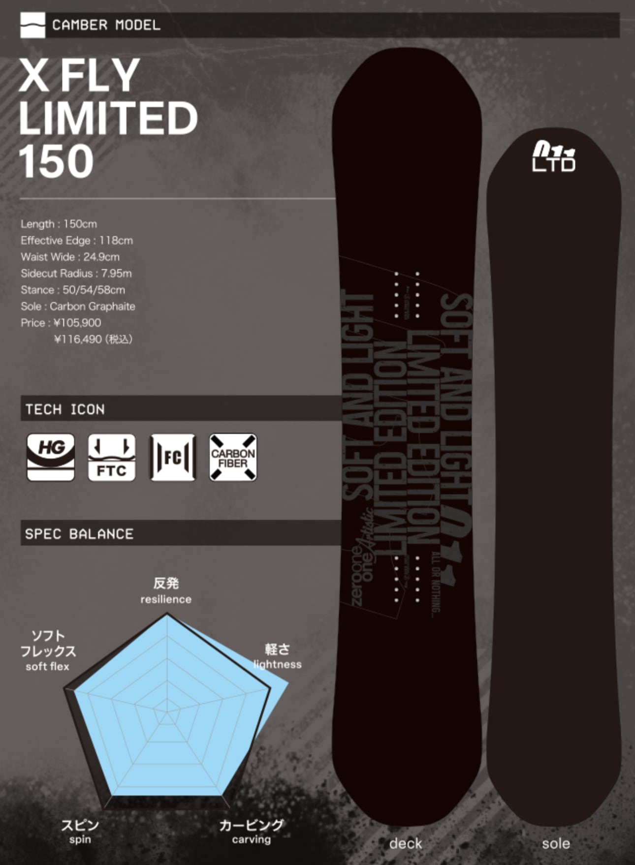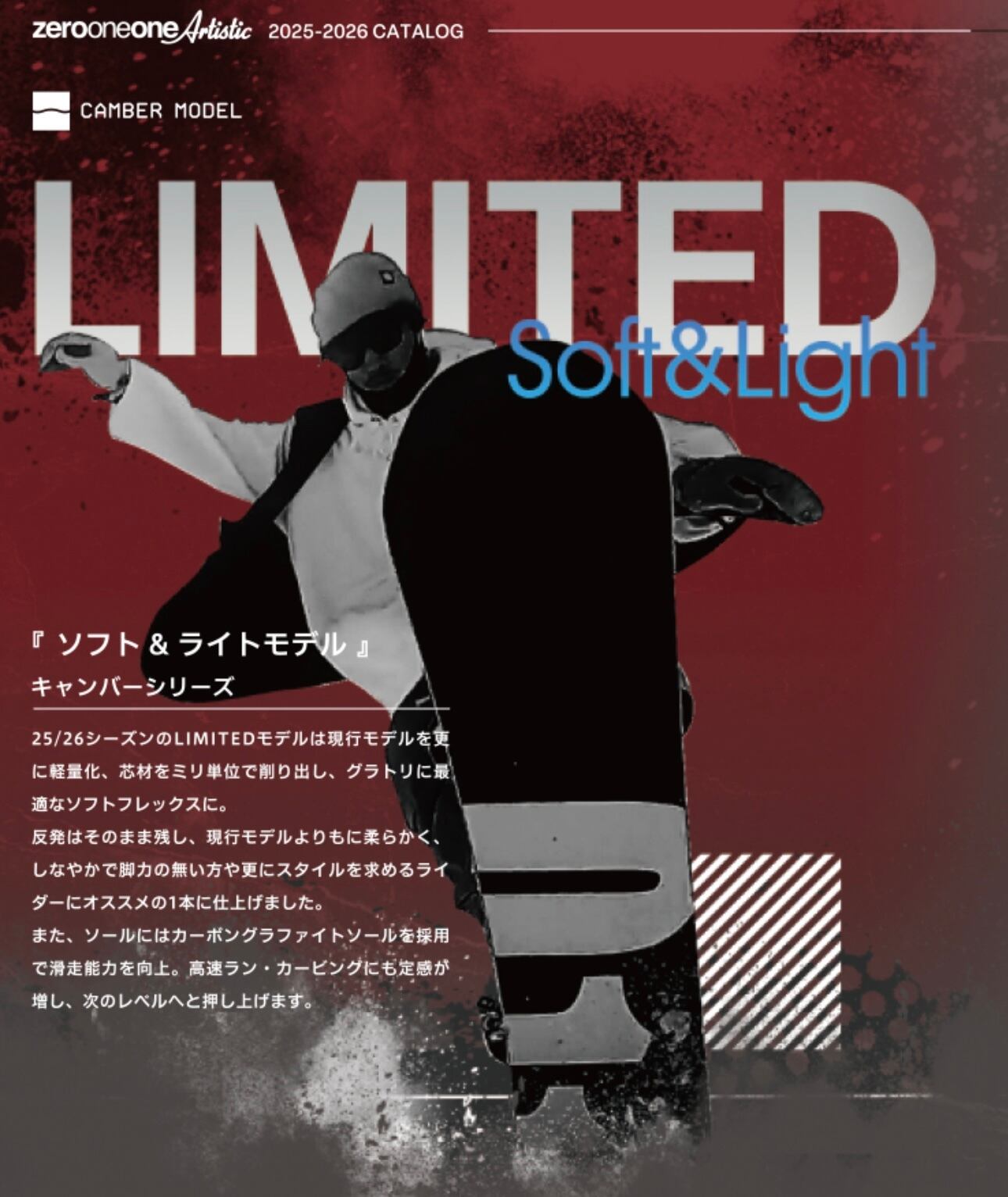 25/26シーズンのLIMITEDモデルは現行モデルを更に軽量化、芯材をミリ単位で削り出し、グラトリに最適なソフトフレックスに。