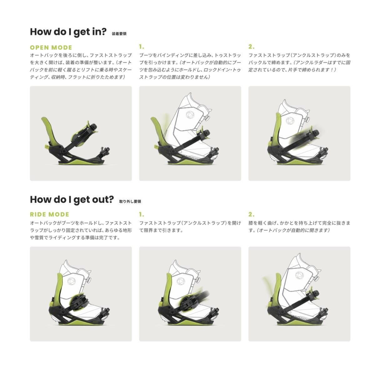 革新的な FASE Fast Entry System(FASE ファストエントリー・システム)の鍵となる Autobackは、ハンズフリーでバインディングにエントリーできますこの直感的なデザインは、ブーツをバインディングに入れると自動的に閉じブーツを持ち上げると開きます。
