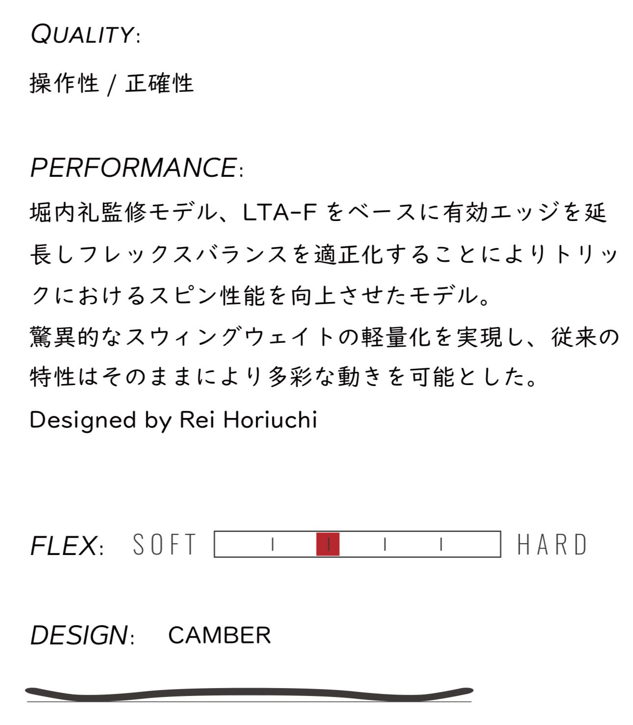 堀内礼監修モデル、LTA-F をベースに有効エッジを延長しフレックスバランスを適正化することによりトリックにおけるスピン性能を向上させたモデル。