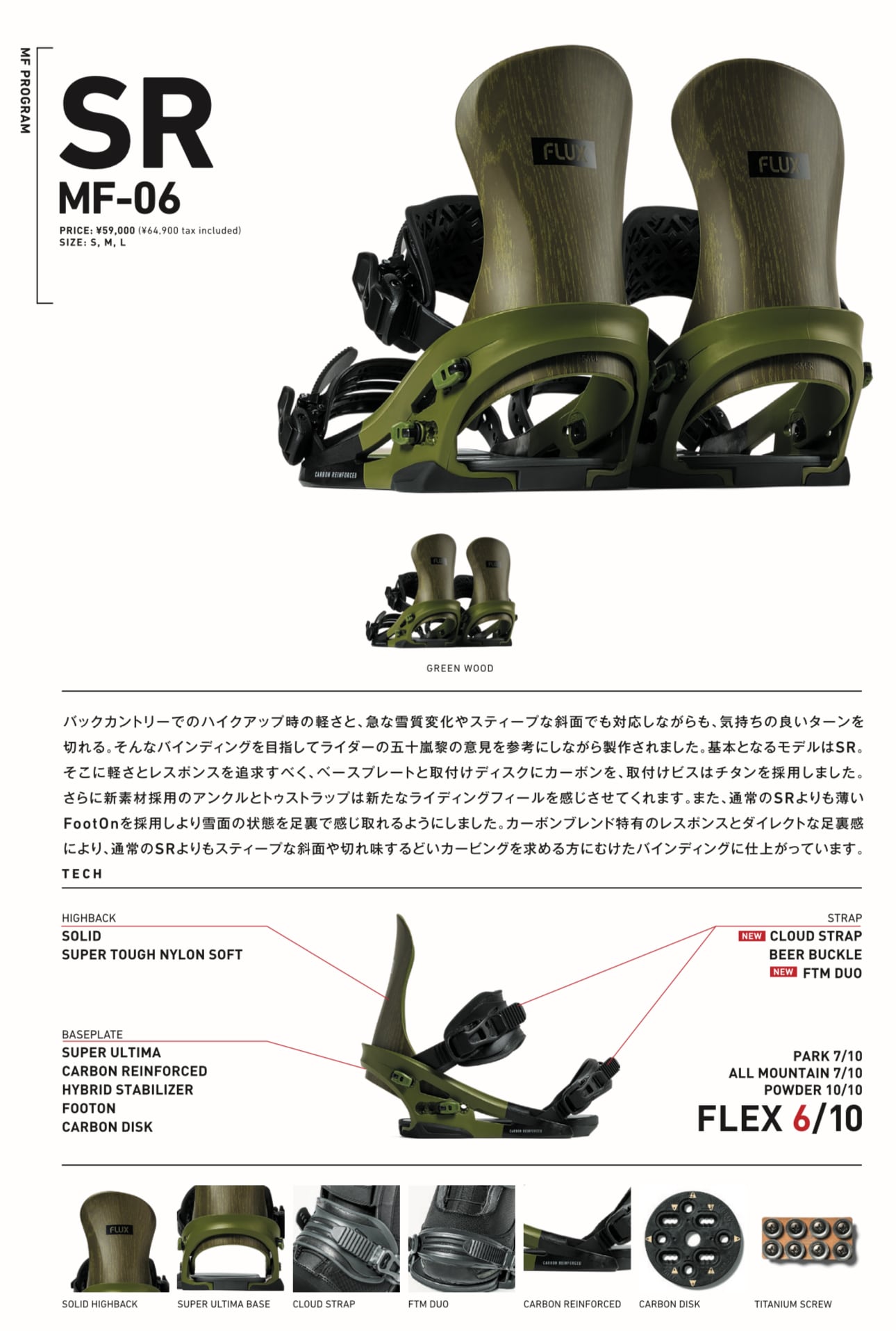 【早期予約】25-26モデル . FLUX .『 SR MF-06 』. Green Wood . フラックス . エスアール エムエフシックス . グリーンウッド . パウダー . オールラウンド . パーク . グラトリ . カービング . フリーラン . ビンディング . バインディング . スノーボード