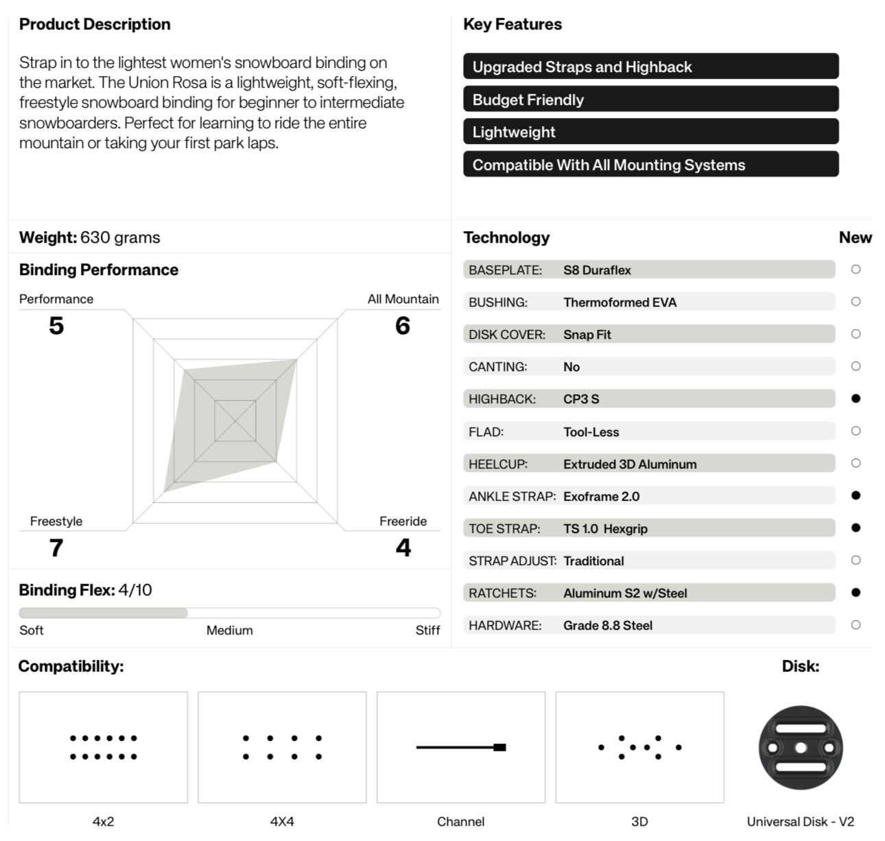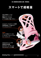 ストラップとハイバックがアップグレードされました。Union Rosaは、軽量でソフトフレックスなフリースタイルスノーボードバインディングで、初心者から中級者まで、お手頃価格でスノーボーダーに最適です。
