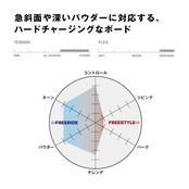 後足部分にはキャンバー構造を採用して爆発的なカービング力を実現。前足部分はフラット構造にすることで、パウダーでの取り回しを自由にさせることができる。圧雪された環境下以外では、ベストな構造と言える。