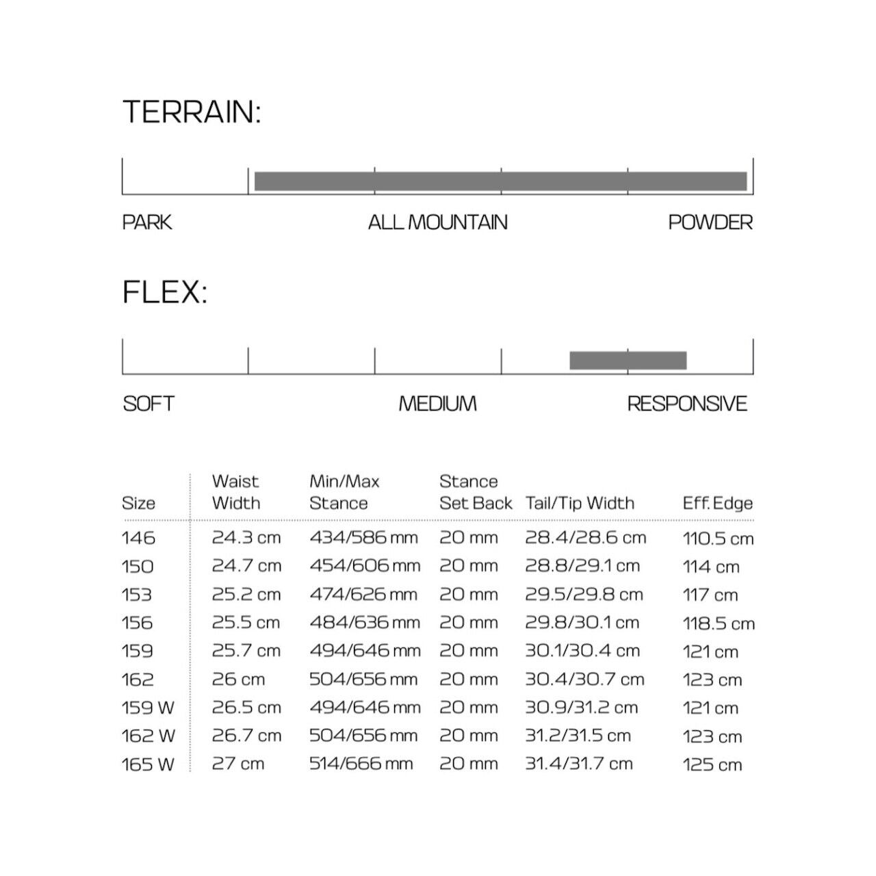 ◇ 環境に優しい素材を使ってハイパフォーマンスなオールマウンテンボードを作るという努力の集大成がHighpathです。テーパードディレクショナルシェイプにロックアウトキャンバーを採用したHighpathは全てのフィールドに対応するオールマウンテンボードの頂点に君臨します。また、今期はフレックスを20%ほど硬くしています。