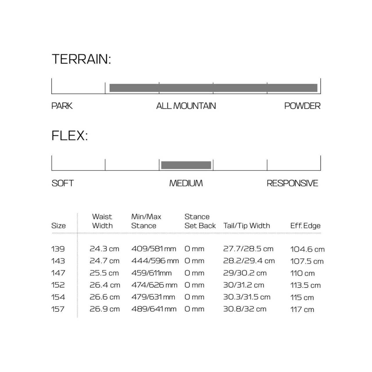 ◇ 短めのサイドカットと太めなテーパードディレクショナルシェイプの組み合わせがターンの入りと抜けに躍動感と機敏さを提供します。