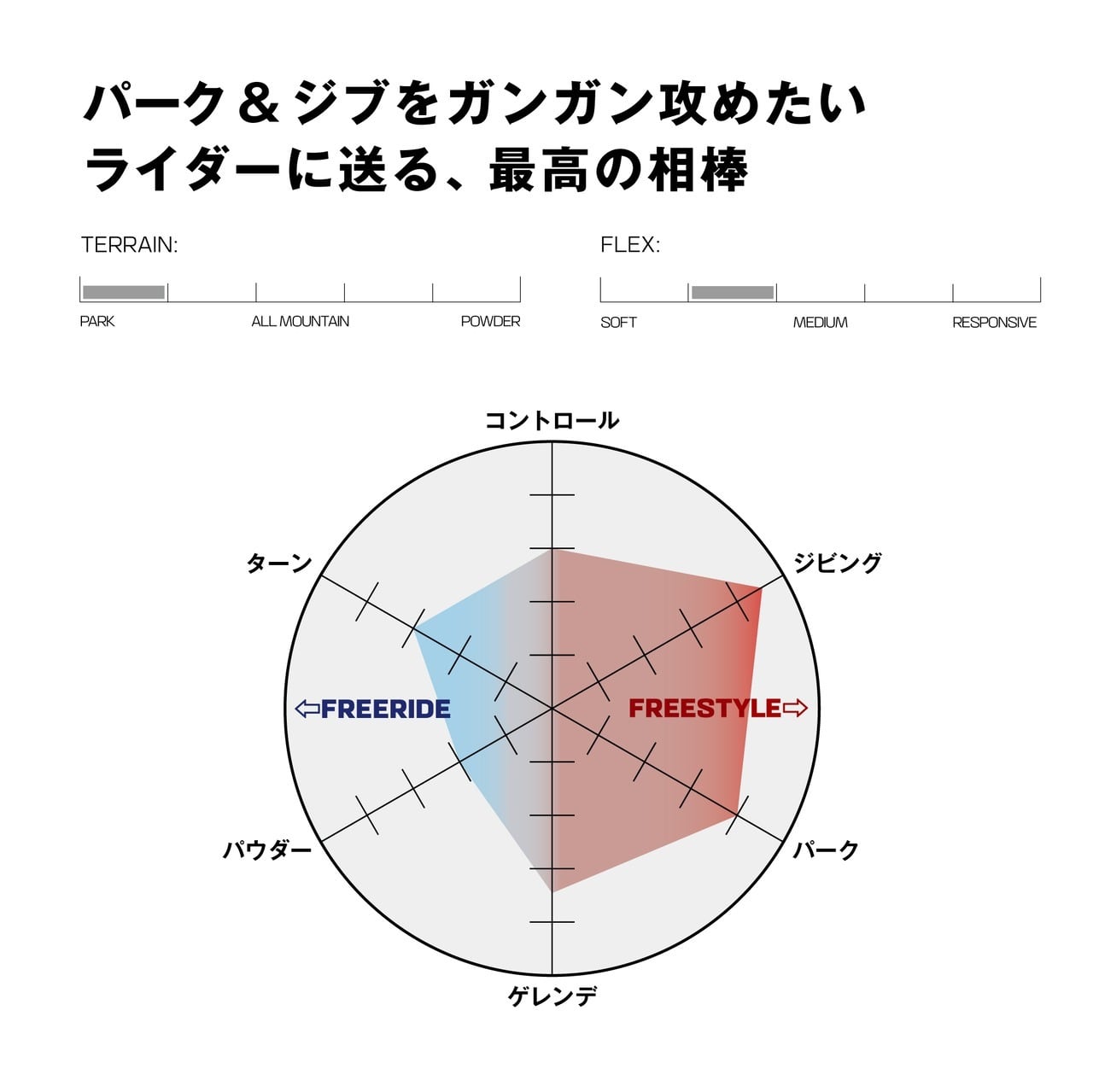 ◇ ロックアウトキャンバーは両足間のフラットゾーンがジャンプやレールのアプローチをサポート。足元のキャンバーゾーンが安定性と、ノーズとテールのロッカーゾーンがプレスのしすさを提供します。