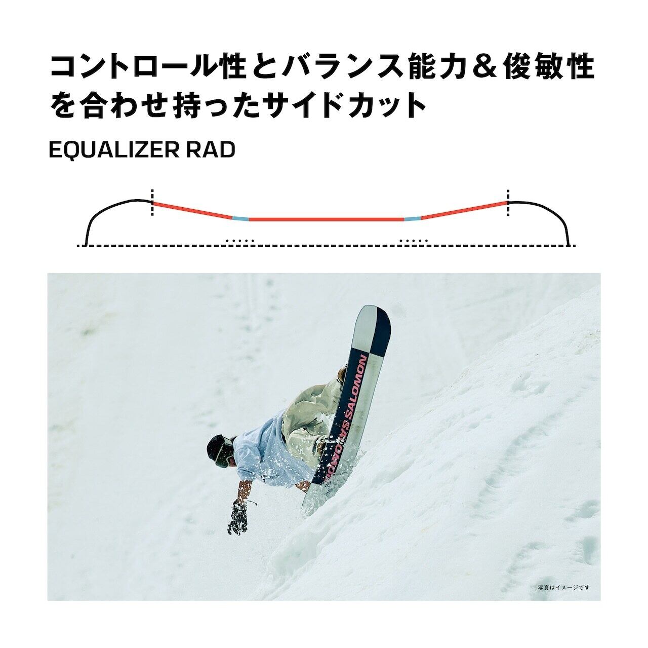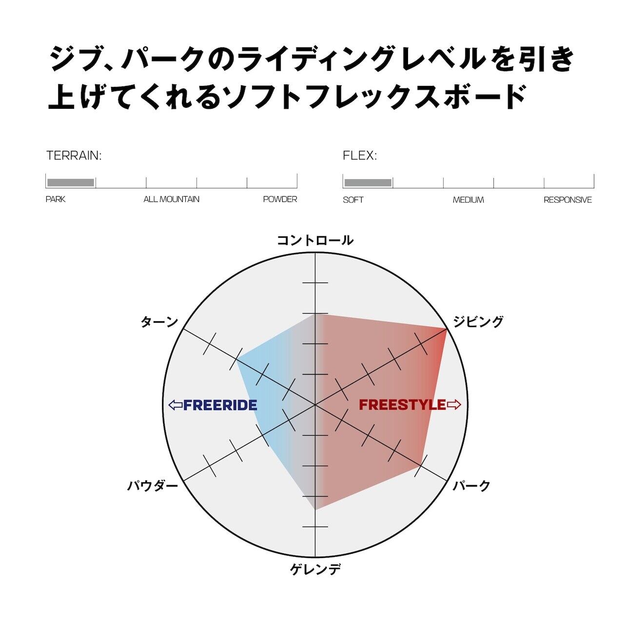 ◇ ロックアウトキャンバーは両足間のフラットゾーンがジャンプやレールのアプローチをサポート。足元のキャンバーゾーンが安定性と、ノーズとテールのロッカーゾーンがプレスのしやすさを提供します。
