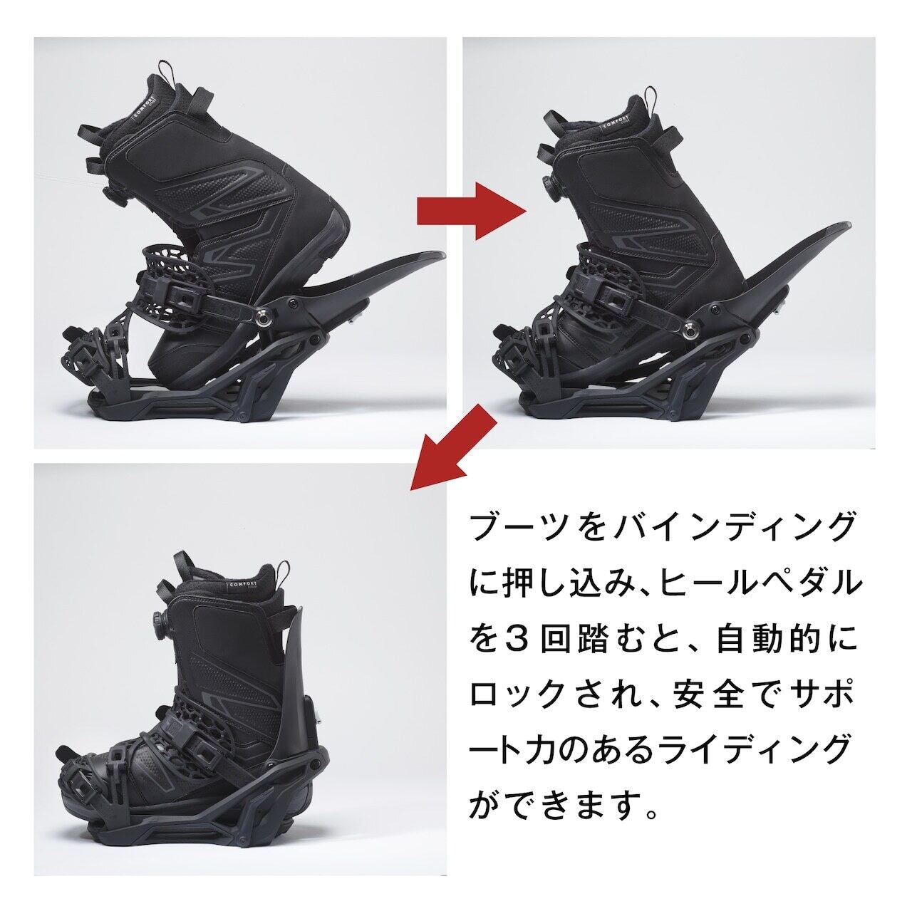 リクライニング可能なSalomonハイバックは、大きく開く設計で簡単に足を入れられるようにしています。ブーツをバインディングに入れ、ヒールペダルを踏むと「3回クリック」で自動的にロックされ、安定したサポート力のあるライドが可能になります。この自動システムでは、リリースレバーを押すだけで簡単に解除でき、足を持ち上げるだけでバインディングから抜くことができます。