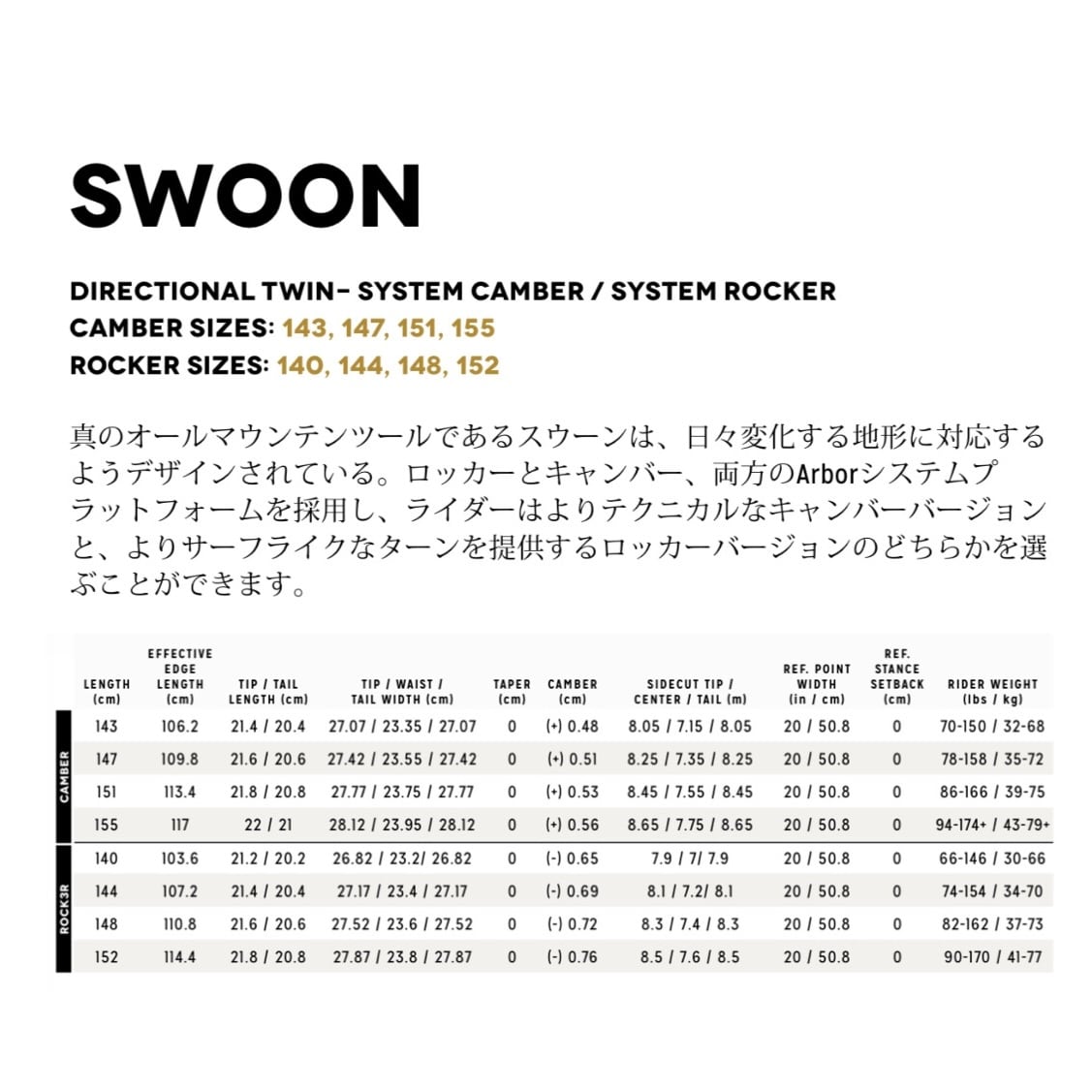 24-25モデル. ARBOR .『 SWOON 』. アーバー . スヌーン . ロッカー . パウダー . バックカントリー . カービング . パーク . フリーラン . グラトリ . スノーボード