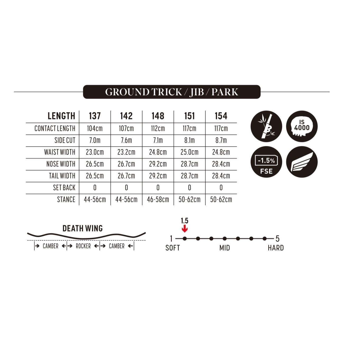 ナチュラルな反発を生み出すバンブーコアとWaxの浸透率、滑走性能に優れているためフリースタイルな動きの制限やグラトリなどのスキルアップをサポートし、ステップアップに最適なモデルです。