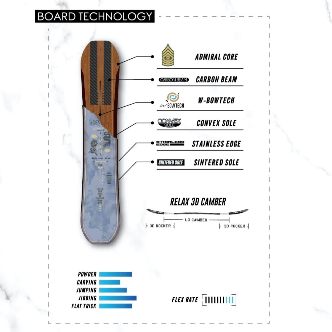 チームライダーのお気に入り、W-BOWTECH と 3D RELAX CAMBER の組み合わせはスムーズなフラットトリックと高いオーリーを可能にする。