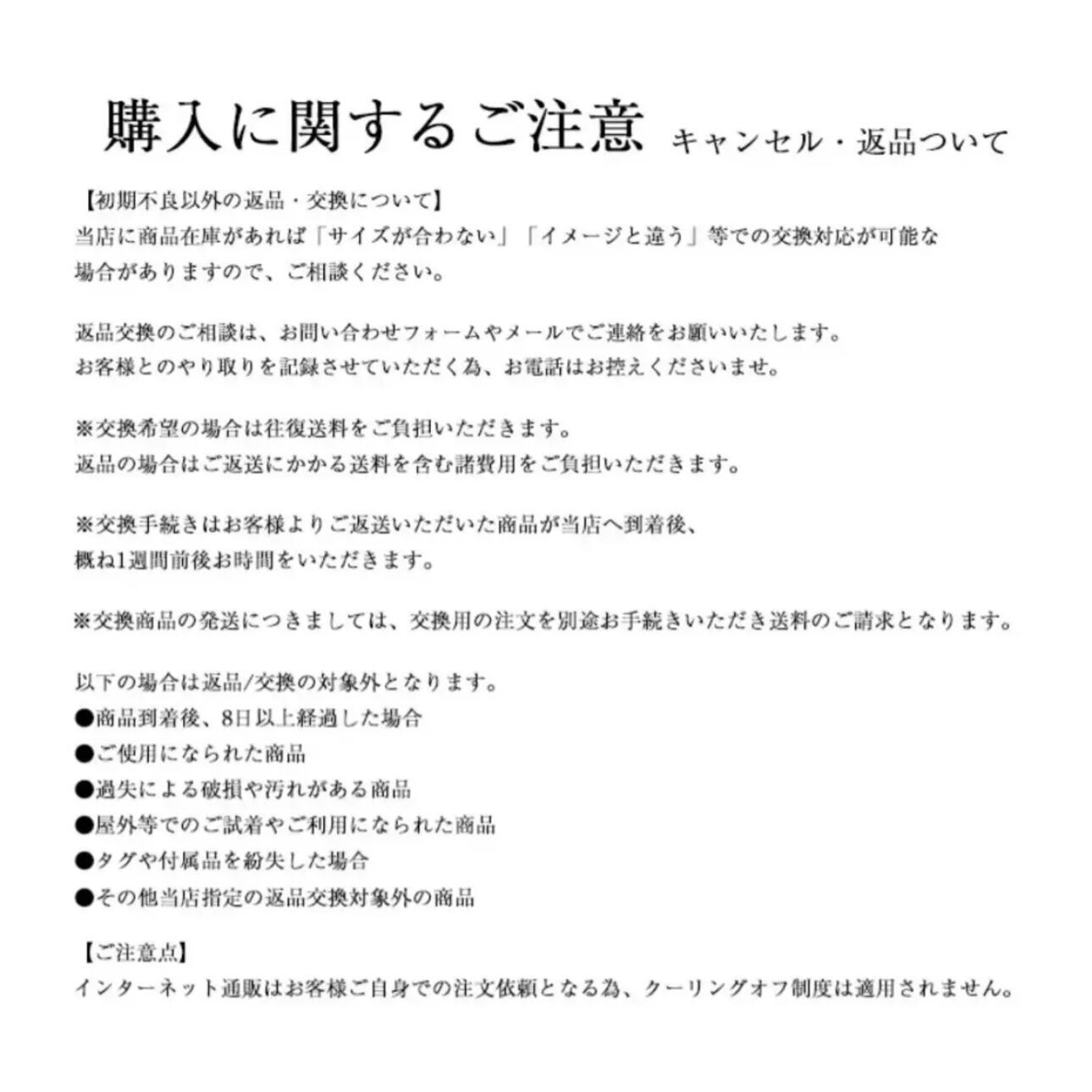 ご注文後のお客様都合によりますカラー・サイズ変更及び返品・キャンセル等は一切お受け致しておりません。万が一キャンセルとなった場合にはキャンセル料として購入金額の10%をお支払い頂く形となりますので予めご了承の程宜しくお願い申し上げます。