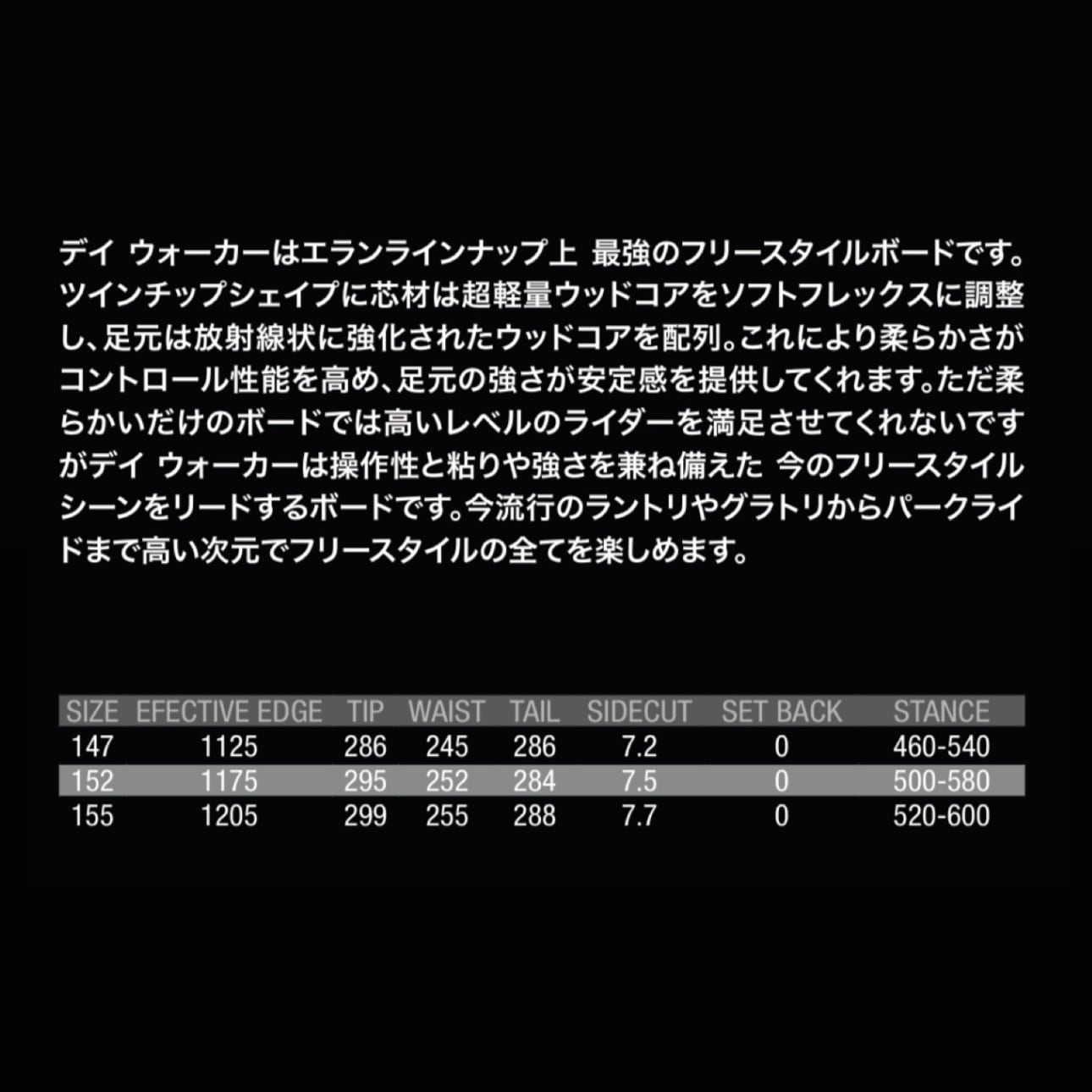 24-25モデル. ELAN .『 DAY WALKER 』. エラン . デイウォーカー . キャンバー . パウダー . カービング . パーク . フリーラン . グラトリ . スノーボード