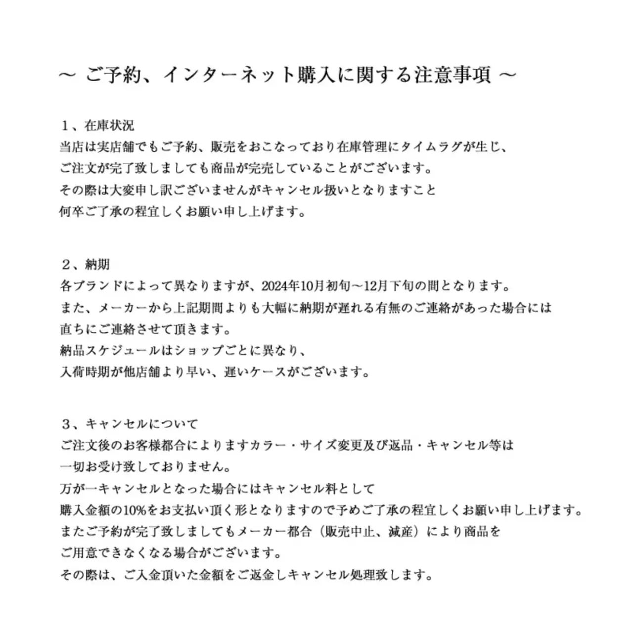 当店は実店舗でもご予約、販売をおこなっており在庫管理にタイムラグが生じ、ご注文が完了致しましても商品が完売していることがございます。その際は大変申し訳ございませんがキャンセル扱いとなりますこと、ご了承の程宜しくお願い申し上げます。