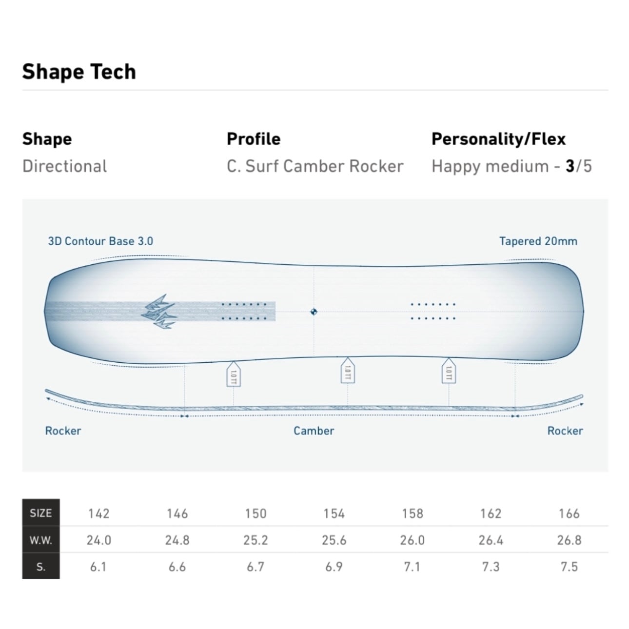 ブラントノーズ、フルサイズのテール、タイトなサイドカット、そして3Dコンツアーベース3.0により、ディレクショナル・ボード特有のキビキビとした乗り味にディレクショナル・ツインのオールマウンテン性能をプラス。