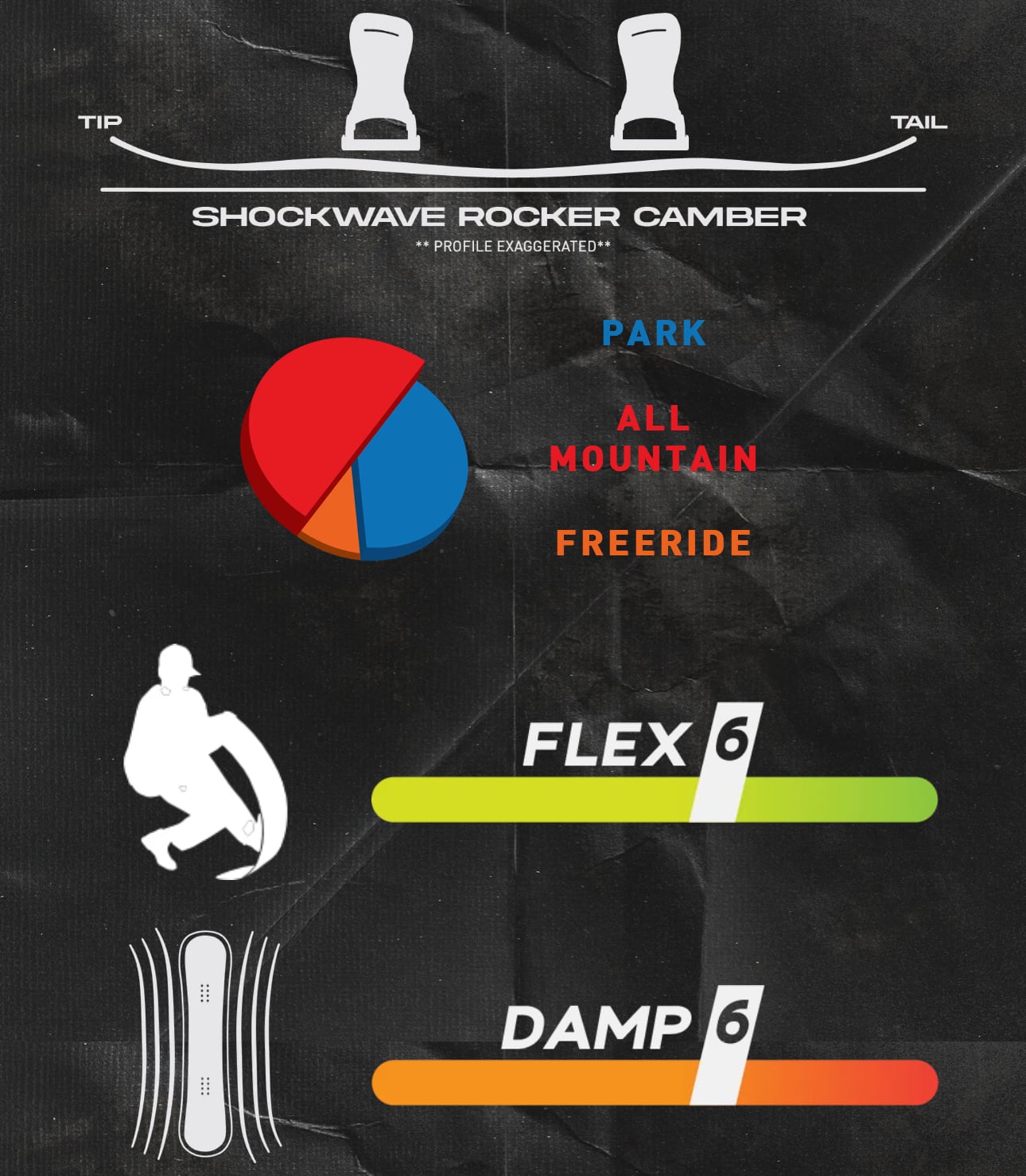 ショックウェーブ・ロッカーキャンバーは、自然な浮力とプレス性を維持しながら、ターンの前後でのポップ、ブースト、そしてズレない正確なエッジホールドを実現。