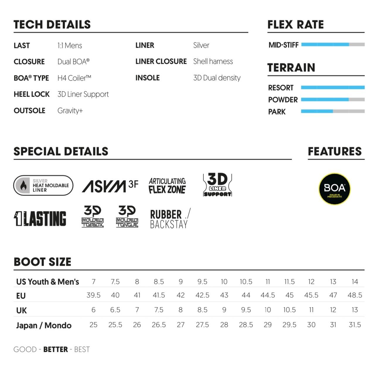 アシンメタリックアッパーはNideckerとFlowのバインディングとしっかりとフィットし、プレッシャーポイントを最小限にしています。
