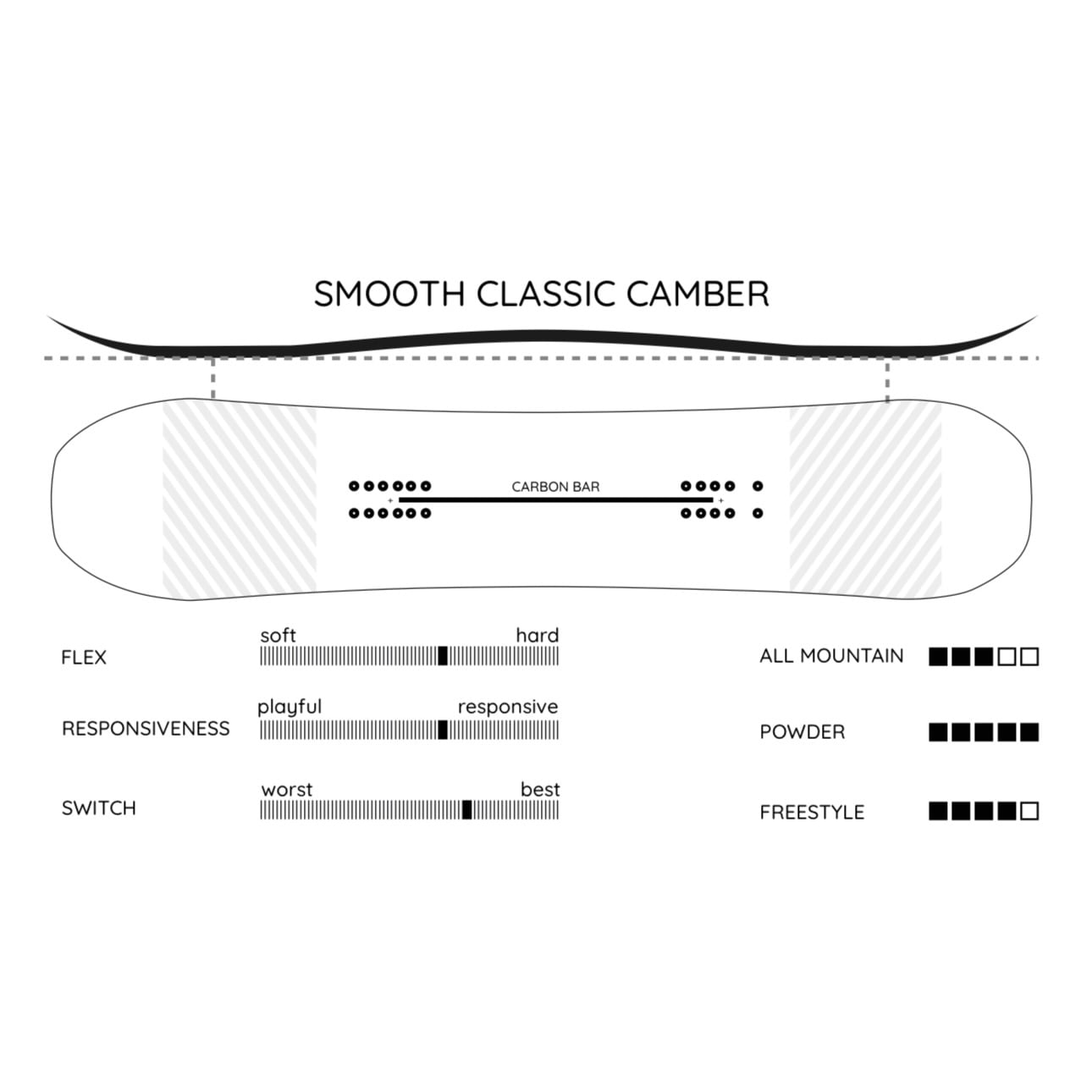 Smooth Classic Camber(スムース・クラシック・キャンバー) は、キャンバーの全長を短くしてライダーに様々な雪面情報を 与えてくれます。