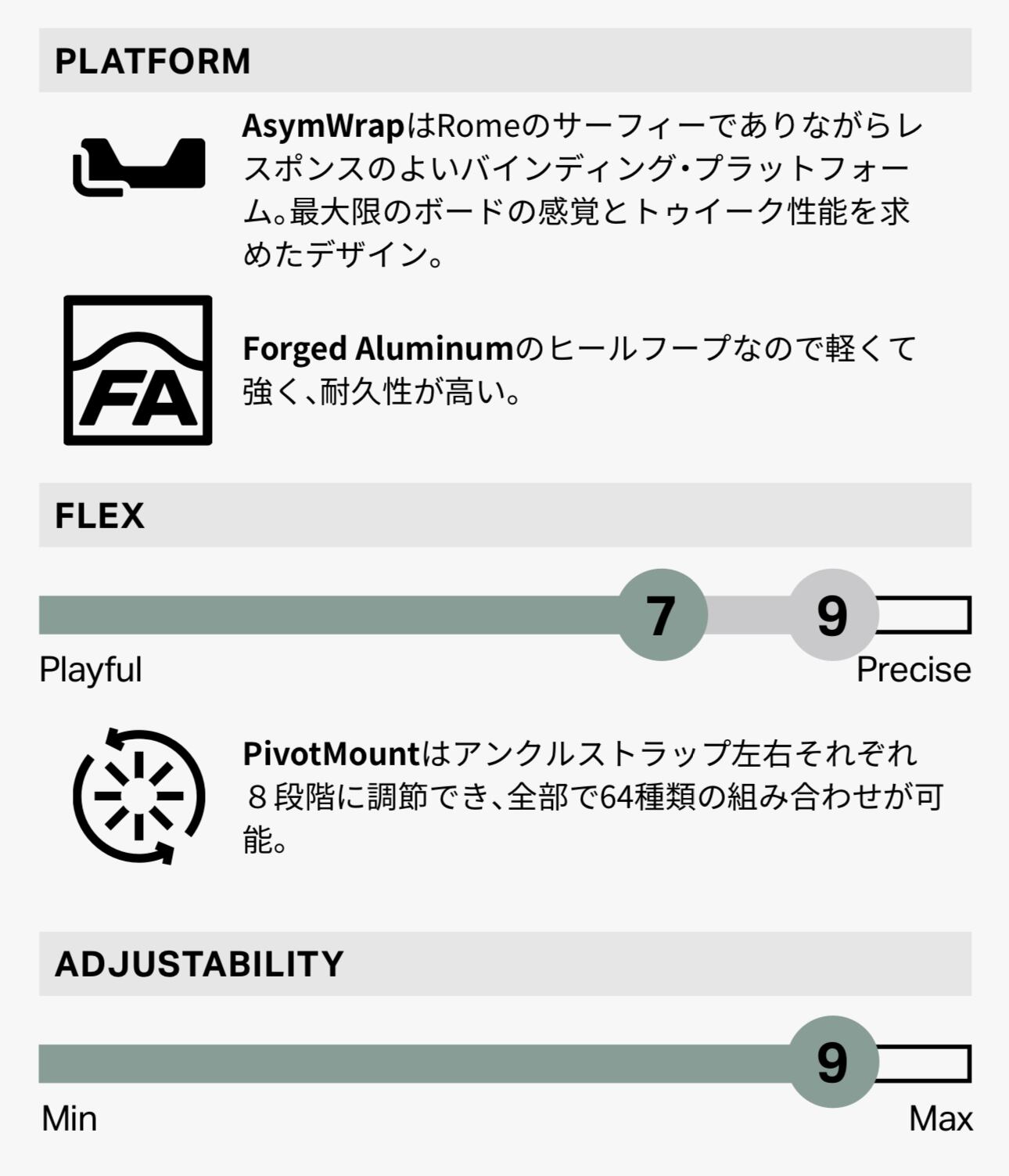 アシムラップはRomeのサーフィーでありながらレスポンスのよいバインディング・プラット フォーム。