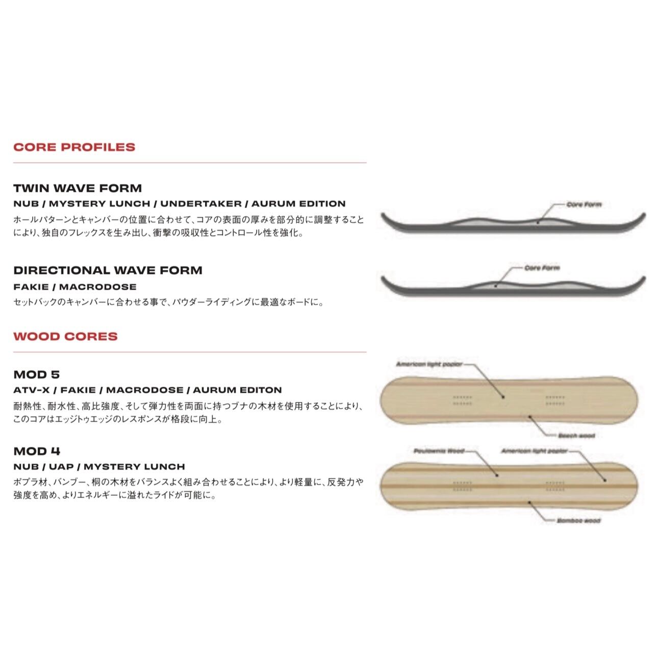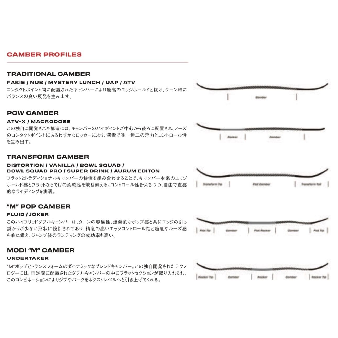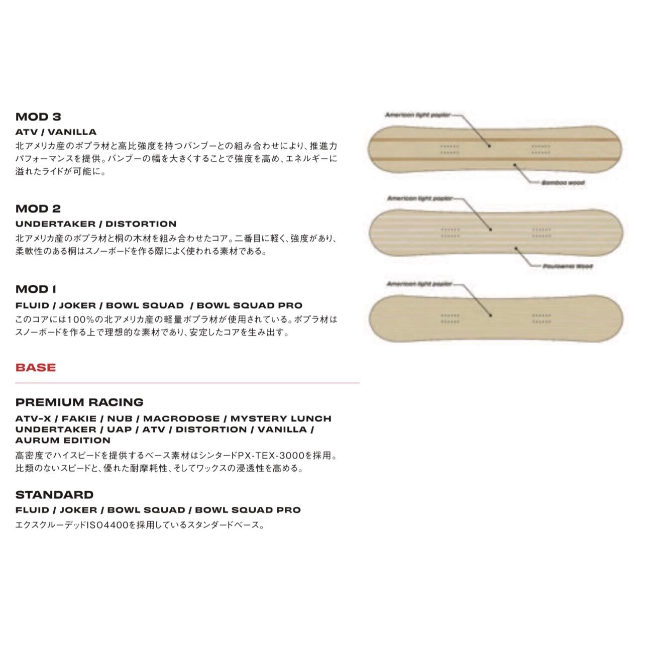 しかし、速いスピードでカービングなどをする時にはトラディショナルキャンバーのようなライドが可能になる。このBOWL SQUADは軽く、ポップ感を多く感じることができ、スタンダードポプラのウッドコアの中に2本の平行したバンブーストリングスが採用され、その上にアイカーボンライトが搭載されている。