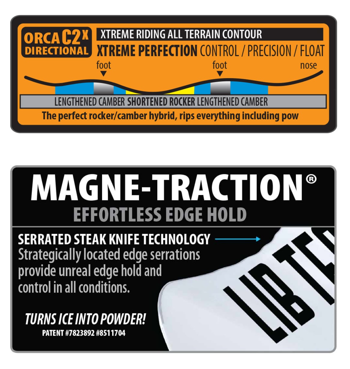マルチディレクショナルボードの頂点に立つAPEX GOLDEN ORCAは新開発の"Techno Pop"カーボンテクノロジーが採用され、縦とクロスに配列したカーボンが剛性、パワー、ポップ、そして足元からコンタクトポイントまでのねじれレスポンスを高め、最高のパフォーマンスを実現します。