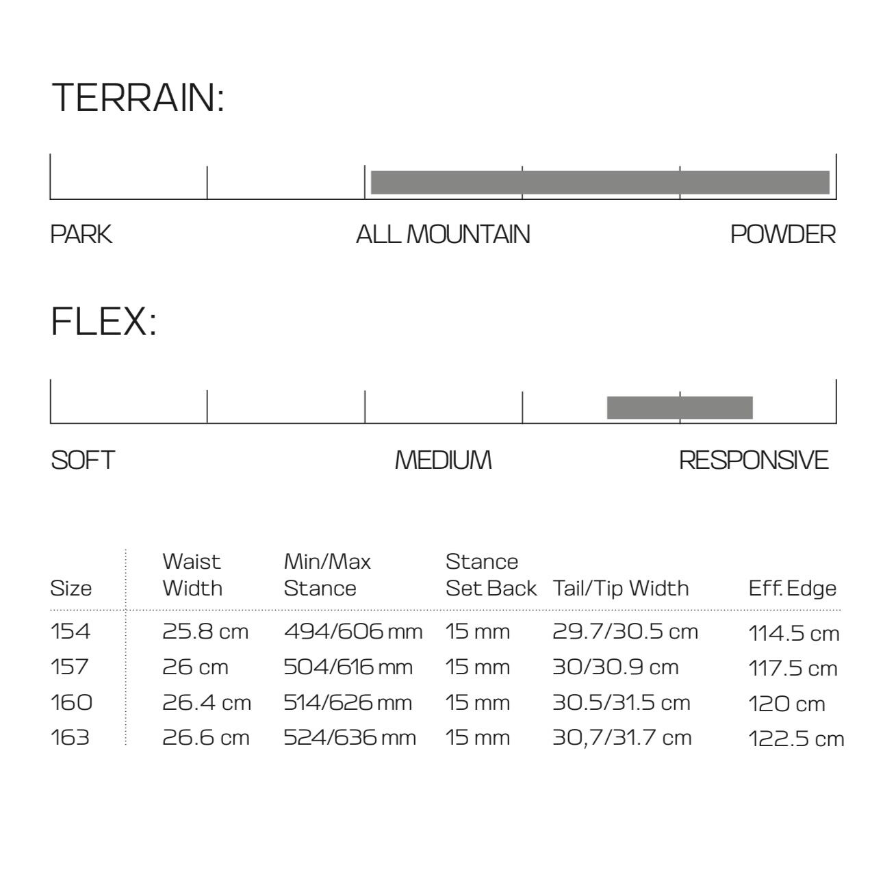 バックシートキャンバーが後ろ足にパワーとコントロール性を、ロッカーゾーンが設定された長いノーズが深いパウダーでも高い浮力を提供します。