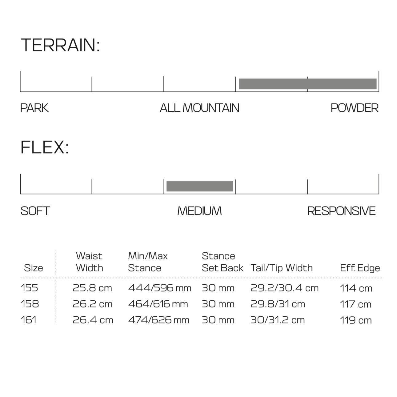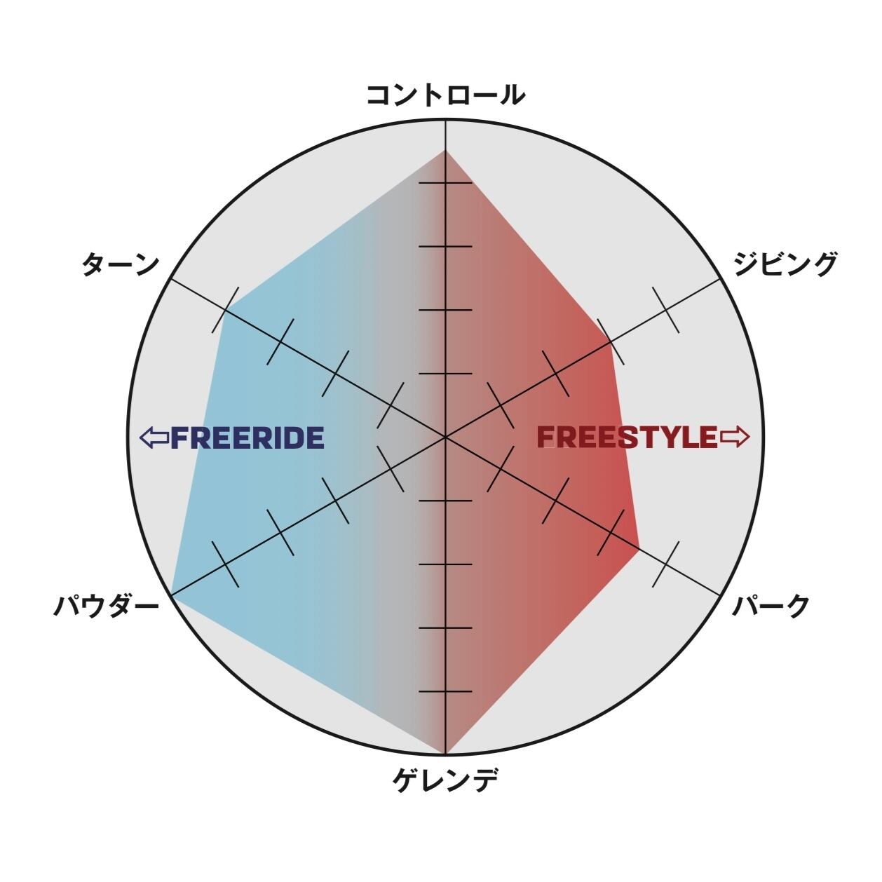 ノーズを従来よりも長く、太くすることで高い操作性を提供し、ノーズとテールに設定されたロッカーゾーンがパウダーで沈まない走破性を提供します。