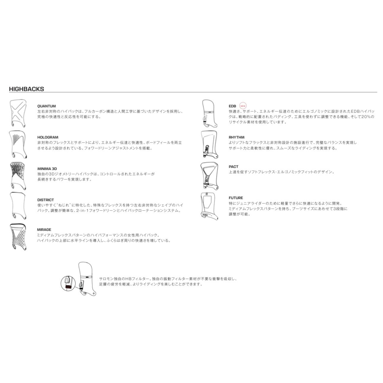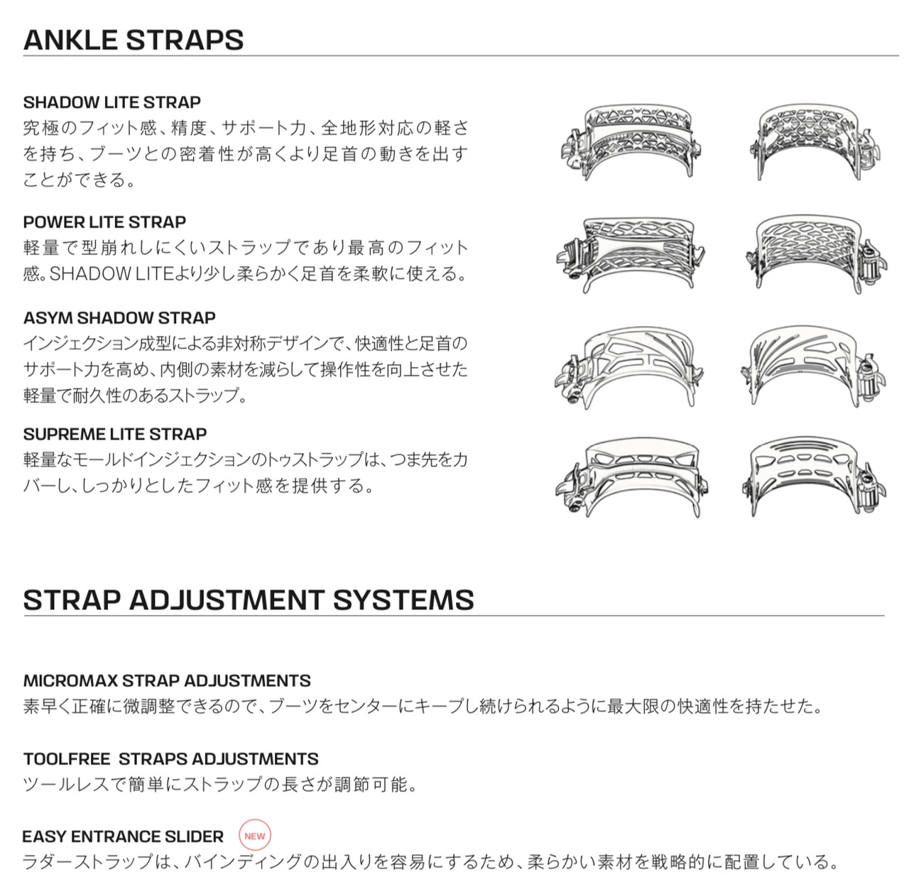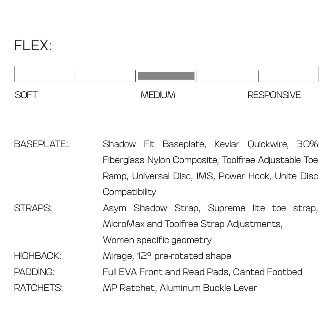 ShadowFitヒールカップがバインディングとブーツの一体感を高めることでより高いパフォーマンスと快適性を提供し、非対称ハイバックとインジェクションストラップがサポートカと操作性をバランス良く提供します。