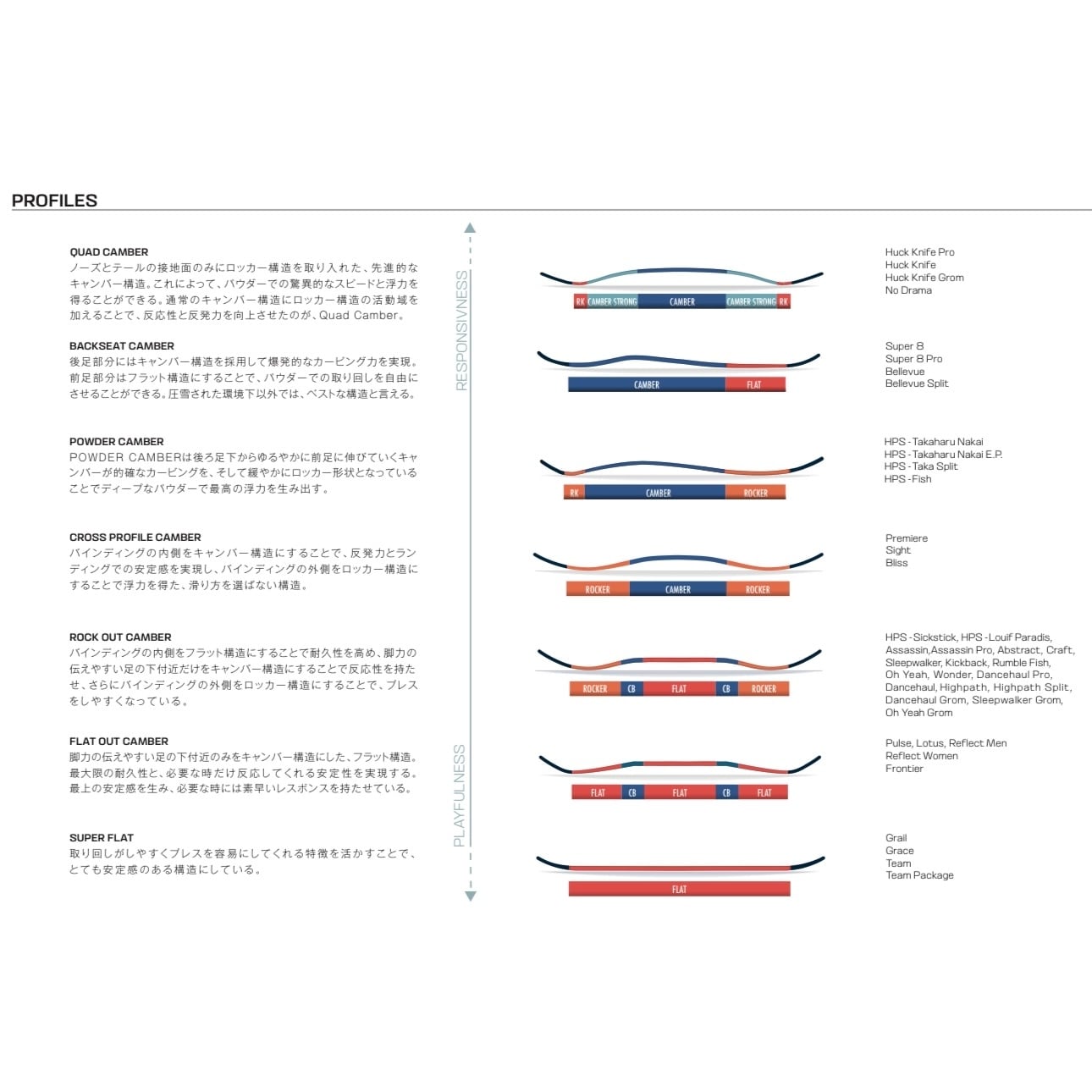 フラットアウトキャンバーは、ノーズとテール、両足の間のフラットゾーンと足元のキャンバーゾーンを組み合わせることで必要な安定性とレスポンスを提供します。