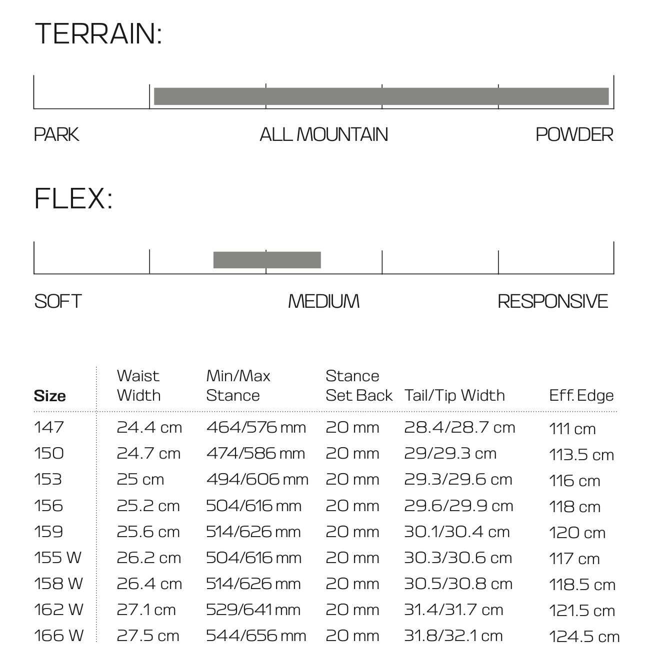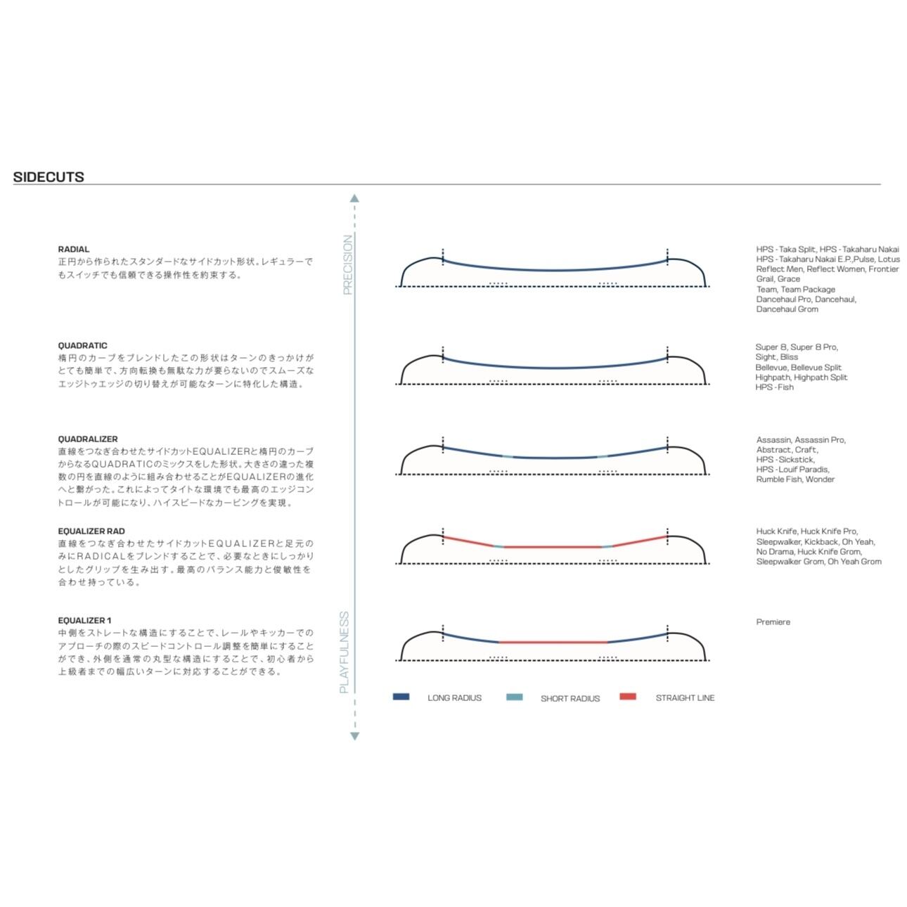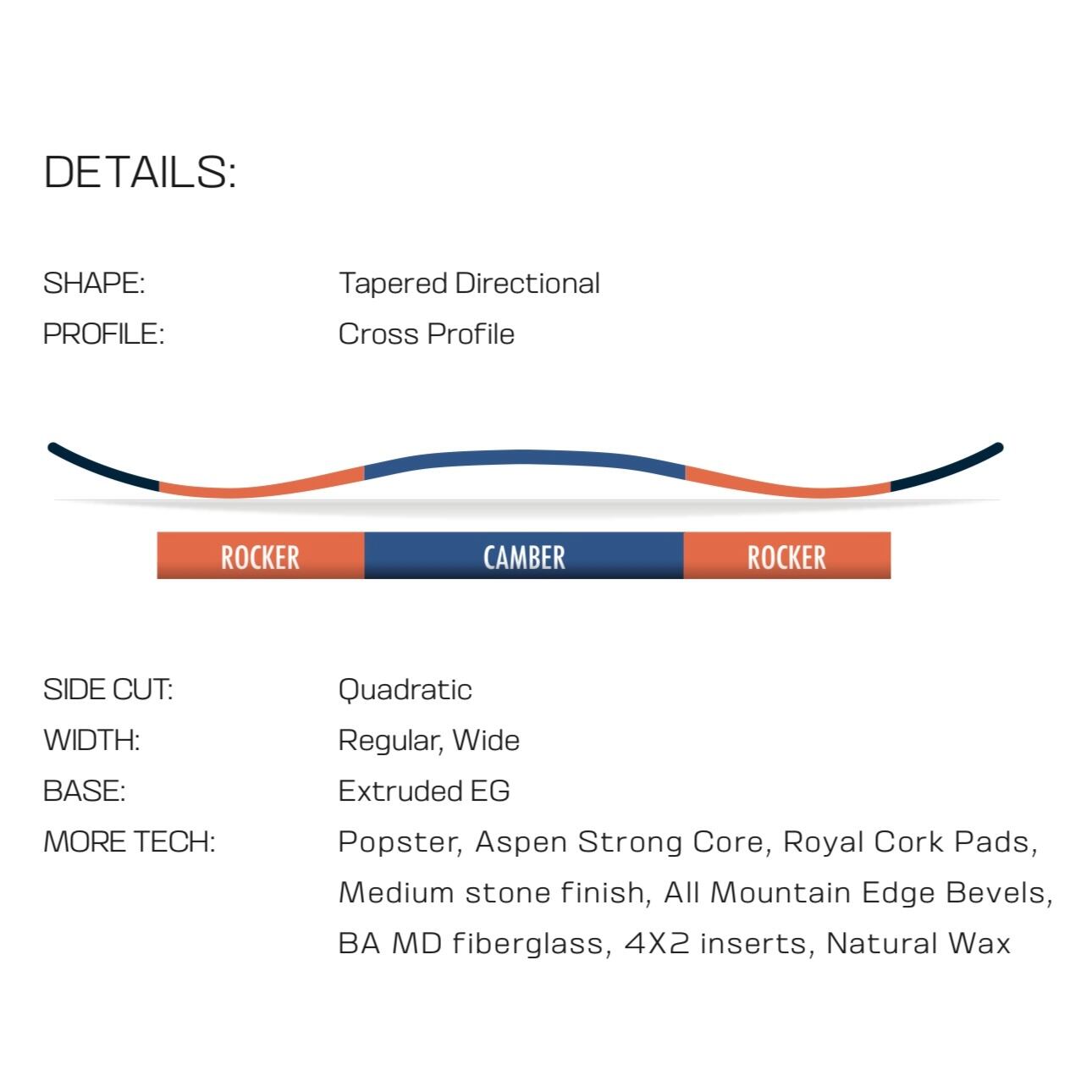 テーパードディレクショナルシェイプがターンの感動と浮力を、クロスプロファイルキャンバーがグルーマーでの安定性を提供します。
