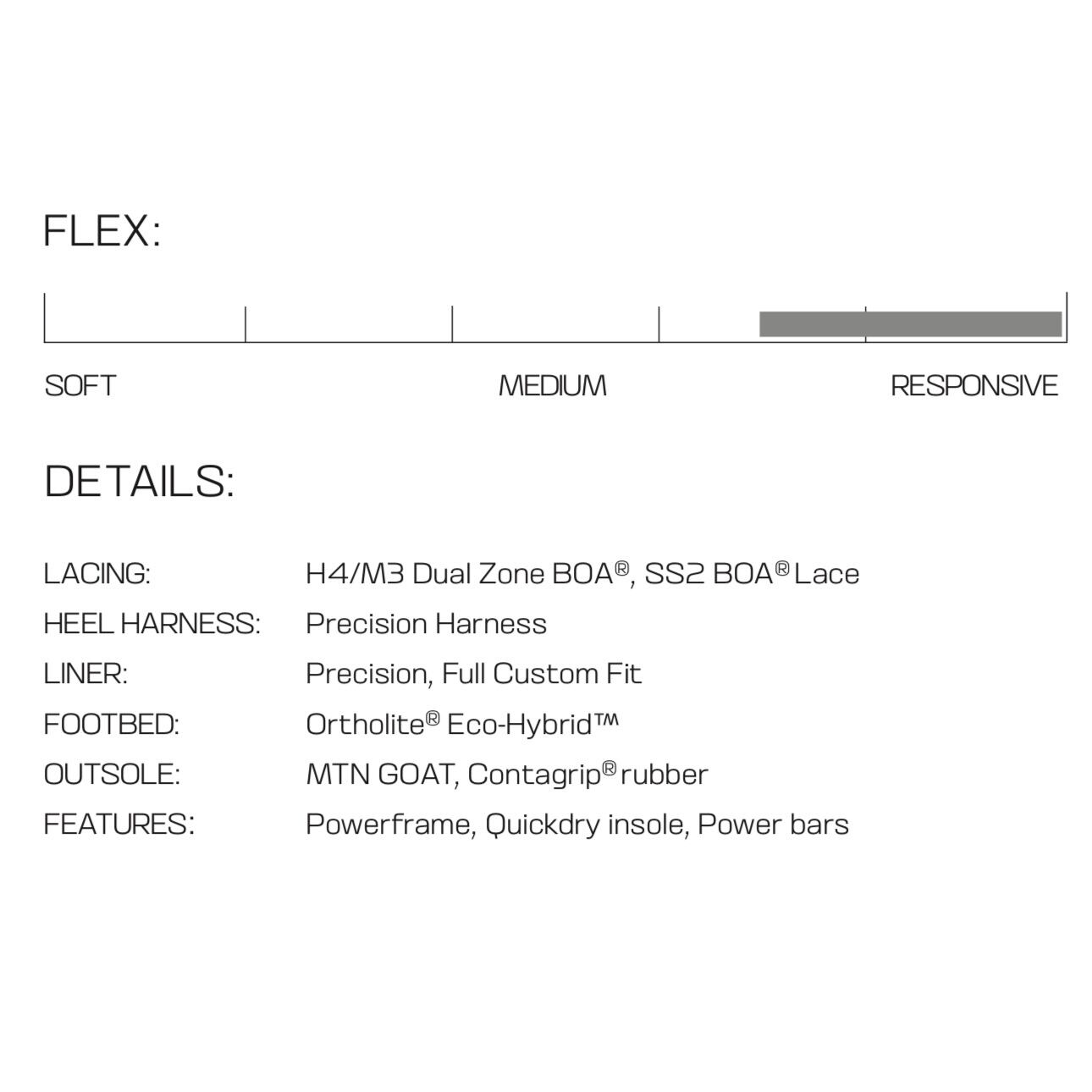硬くて反応の良いアッパーにフィットトゥライド構造を組み合わせ、MTNGOATアウトソールとプレシジョンハーネスを搭載することで、シーズンを通して、履き心地、耐久性、反応の良さを求めるライダー達を満足させる性能を提供します。