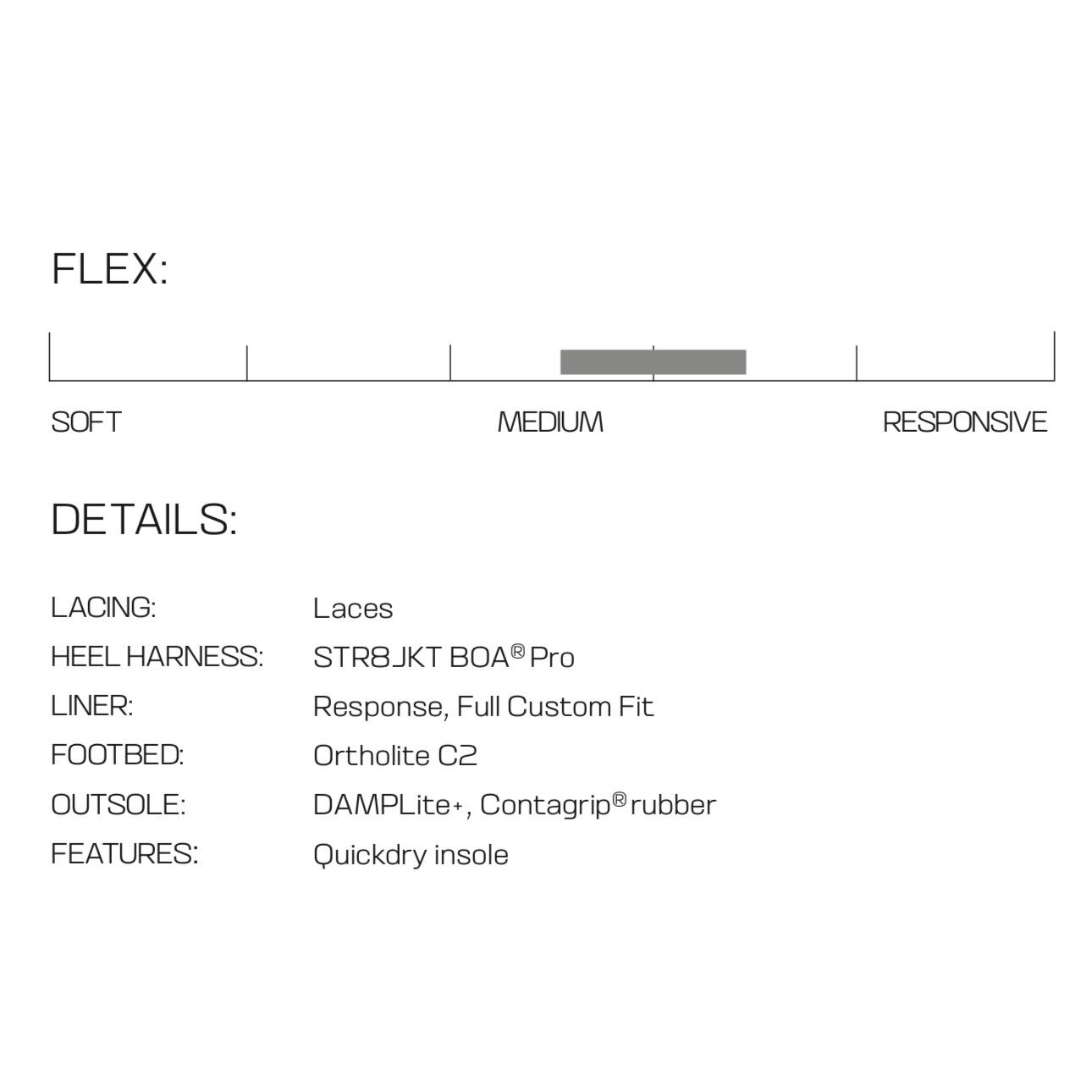 プログレッシブフレックス、オーソドックスなシューレース、STR8JKT BOA®PROの組み合わせが、ブーツと踵の一体感を高め、正確でズレのないフィット感を提供します。