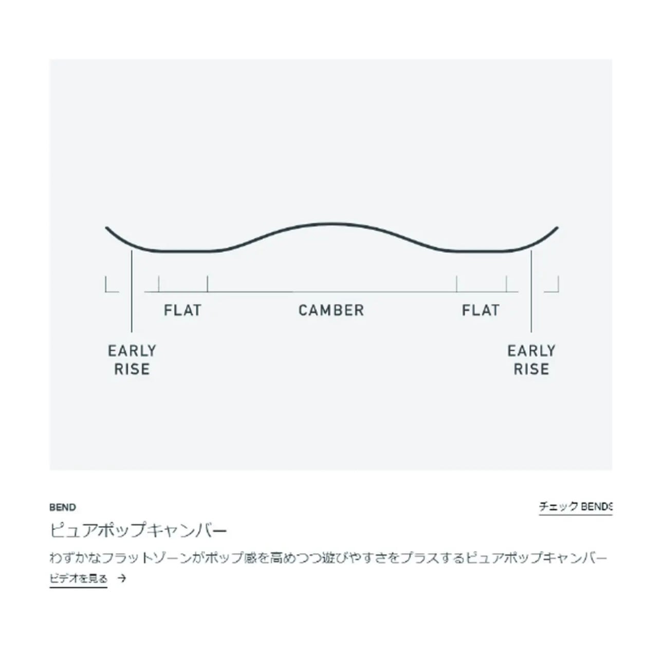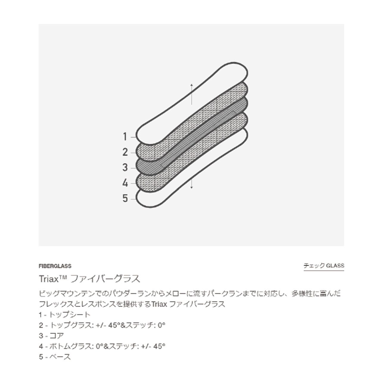 ボードの反発力を高めるコアをはじめ、パウダーからボックスまででフリーダムにあふれたフィールを提供するスクープなど、扱いやすいだけでなく楽しいライディングを保証する機能も満載です。