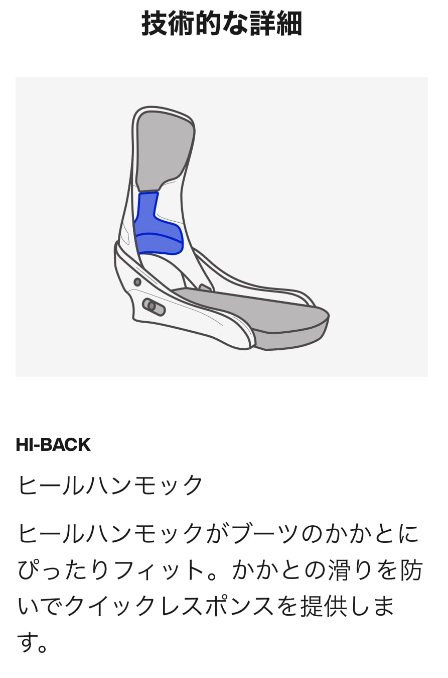 あらゆる斜面を滑り倒すために設計され、優れたホールド感とレスポンスを提供するアンクルのハンモックストラップやハイバックのヒールハンモックを搭載。